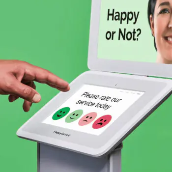 Smiley Touch™ este un sistem de feedback pentru clienți cu ecran touchscreen care permite nu doar evaluarea sentimentului (prin simbolurile „smiley”), ci și colectarea de răspunsuri mai detaliate, inclusiv comentarii deschise și întrebări urmărite ca parte a unui sondaj personalizat. Astfel puteți înțelege „de ce”-ul din spatele feedback-ului clienților Dvs. în timp real, lucru care permite rezolvarea mai rapidă a eventualelor probleme și îmbunătățirea performanței și imaginii serviciilor oferite.