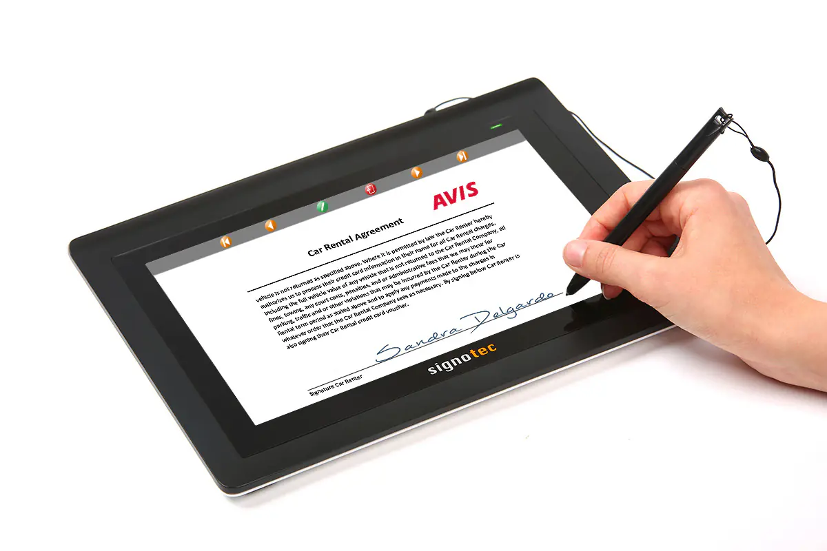 The signotec Delta is designed for applications where it is important that complete documents can be displayed - A4 documents are shown in their original width. For scrolling, you can easily move the pencil on the display up or down to let the document slide. It is the ideal solution for banks, government agencies and businesses where complex documents need to be read before signatures are required.