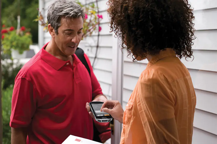 When you're holding a mobile terminal, you can easily access the information, internal apps, or people who can help you solve the task you're looking at. The benefits of using this tool are higher productivity and improved services.